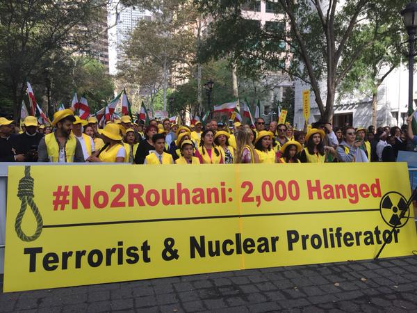 وهتف المتظاهرون بشعار “لا لروحاني”، “اطردوا روحاني من الأمم المتحدة”، رافعين صور مريم رجوي من زعماء المنظمة، وانضم إليهم عدد من الأميركيين.