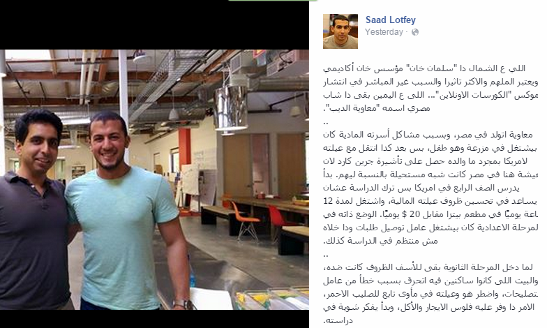 وأردف: “معاوية زي شباب مصريين كتير، الفرق بس إنه علم نفسه بنفسه، واستغل كل الموارد المتاحة، أما الباقي معتقد إن خلاص طالما فاته قطر المدرسة والجامعة ماينفعش يتعلم… التعلم الذاتي موجود والتعلم الأونلاين ببلاش، والتعلم المعتمد عبر النت أرخص من ساندويتش ممكن تاكله في أي مطعم، كل اللي عليك بس إنك تاخد خطوة بس مش أكتر”.