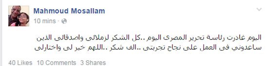 وقال الكاتب الصحفي عبر صفحته الرسمية علي موقع التواصل الاجتماعي فيسبوك ” اليوم غادرت رئاسة تحرير المصرى اليوم ..كل الشكر لزملائى واصدقائى الذين ساعدوني فى العمل على نجاح تجربتى ..الف شكر ..اللهم خير لى واختار لى”.