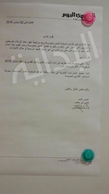 وطالب المنشور الإداري “جميع الزملاء بالتوجه إلى إدارة الموارد البشرية بحد أقصى يوم 30 سبتمبر 2015 لتوقيع إقرار التفرغ واستلام القرار”، متوعدا بتطبيق الإجراءات القانونية في حالة مخالفة اللوائح المنظمة للعمل بالمؤسسة بمعرفة المستشار القانوني.