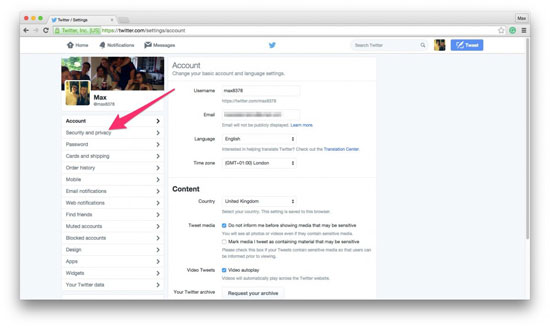 1- ادخل على حسابك الشخصي على الموقع واتجه إلى الإعدادات settings من هنا https://twitter.com/settings/account ثم إلى الأمان والخصوصية Security and privacy.