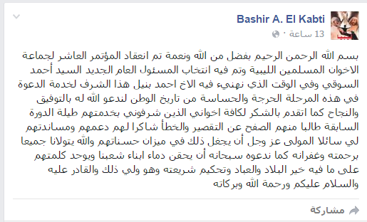 أعلن المراقب العام لجماعة “الإخوان المسلمين” في ليبيا، بشير الكبتي، عبر منشور له على موقع التواصل الاجتماعي “فيس بوك”، انتخاب مراقب جديد للجماعة.
