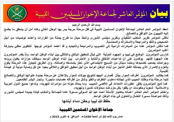 وأكدت جماعة الإخوان الليبية، أن “المؤتمر تناول الوضع في ليبيا والجهود الدولية التي تبذل لتحقيق الوفاق والتلاقي بين أبناء الوطن الواحد”، موضحةً أن الطريق لتجاوز هذه المرحلة يكون بالعزم والإصرار من أجل التوافق بعيدًا عن كل وصاية دولية أو هيمنة إقليمية.