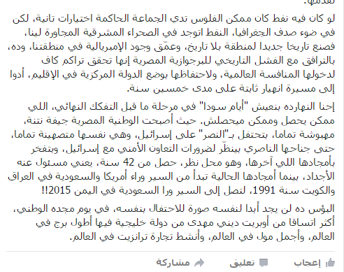 وختم: “إحنا النهارده بنعيش “أيام سودا” في مرحلة ما قبل التفكك النهائي، اللي ممكن يحصل وممكن ميحصلش، حيث أصبحت الوطنية المصرية جيفة نتنة، مهبوشة تماما، بتحتفل بـ”النصر” على إسرائيل، وهي نفسها متصهينة تماما، حتى جناحها الناصري بينظّر لضرورات التعاون الأمني مع إسرائيل، وبتفخر بأمجادها اللي آخرها، وهو محل نظر، حصل من 42 سنة، يعني مسئول عنه الأجداد، بينما أمجادها الحالية تبدأ من السير وراء أمريكا والسعودية في العراق والكويت سنة 1991، لتصل إلى السير ورا السعودية في اليمن 2015!!“.