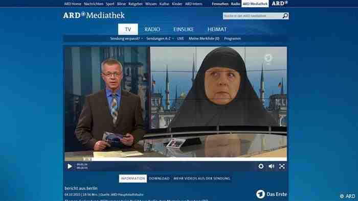 ظهرت المستشارة الألمانية أنجيلا ميركل، وهي ترتدي الحجاب خلال البرنامج الألماني الشهير “مجلة التليفزيون” الذي يبث من برلين، حيث عرضت القناة التليفزيونية الأولى “إيه آر دي” ARD، صورة مركبة لميركل، وهي ترتدي عباءة سوداء اللون، ومن ورائها مبنى الرايخستاج وعليه مآذن ورمز الهلال.