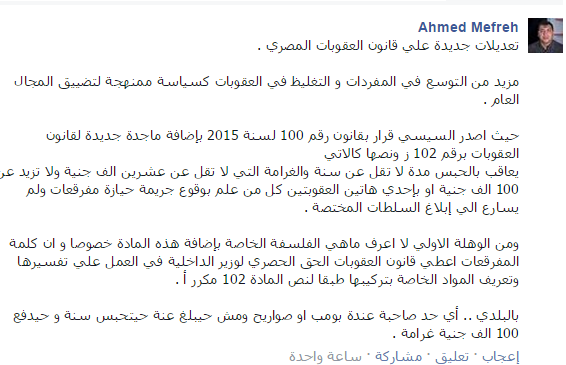 وصف الناشط الحقوقي احمد مفرح، مدير مؤسسة الكرامة لحقوق الإنسان، التعديلات الجديدة علي قانون العقوبات المصري بأنهامزيد من التوسع في المفردات و التغليظ في العقوبات كسياسة ممنهجة لتضييق المجال العام .