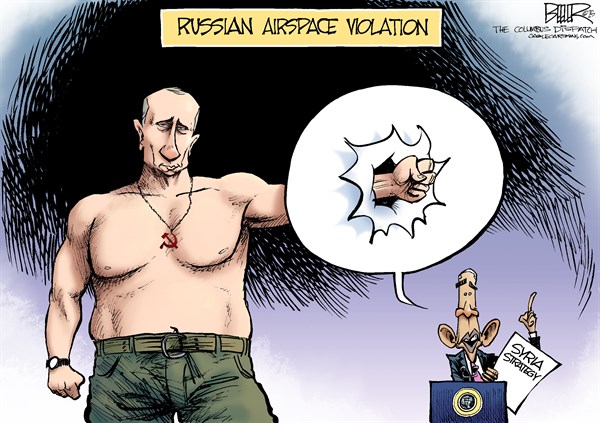 وأضافت صحيفة الجارديان البريطانية كاريكاتيرًا يصور حالة الاستراتيجية الأميركية  في سوريا بعد أن دمرها الرئيس الروسي فلاديمير بوتين.