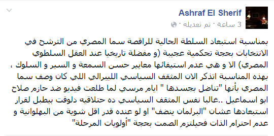وأضاف -عبر “فيس بوك”- “غالبًا نفس المثقف السياسي ده حتلاقيه دلوقتي بيطبل لقرار استبعادها عشان “البرلمان ينضف” أو لو عنده قدر أقل شوية من البهلوانية وعدم احترام الذات فحيلتزم الصمت بحجة “أولويات المرحلة””.