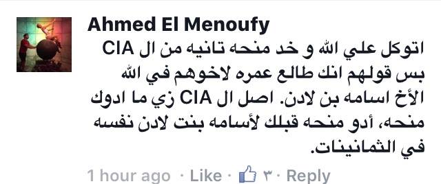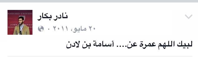 أعاد نشطاء على موقع التواصل الاجتماعي “فيس بوك” اليوم إلى حالة التفاعلية والتعليق والنقاش، منشورًا قديمًا يعود إلى العام 2011، للقيادي بحزب النور السلفي، نادر بكار، نائب رئيس الحزب لشؤون الإعلام، كتب فيها: “لبيك اللهم عمرة عن.. أسامة بن لادن”.