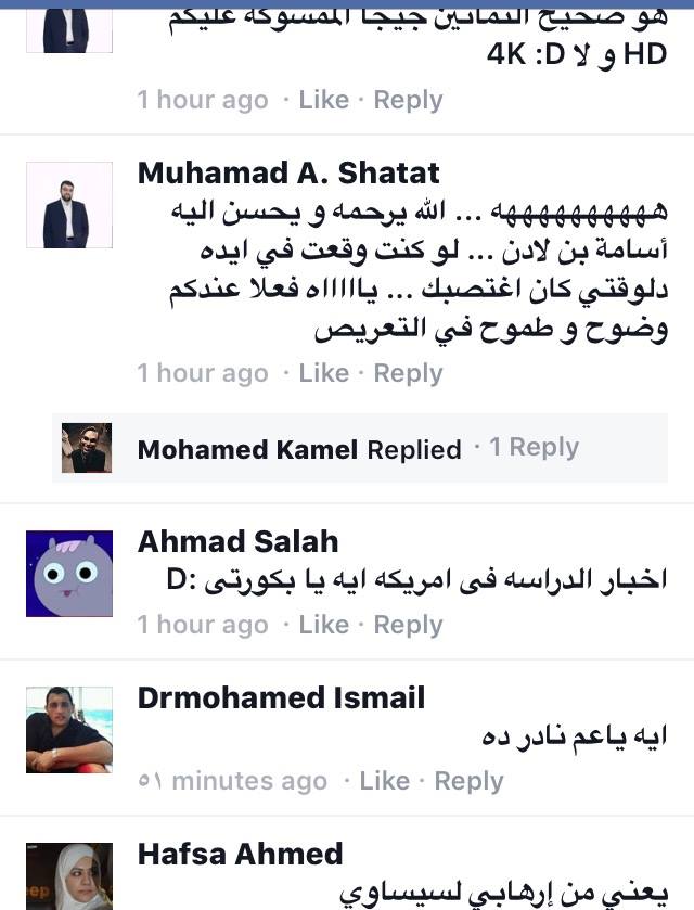 أما محمد عبد الكريم فقال: “بلاغ للأمن الوطني هذا الشخص يتغزل في زعيم تنظيم ما يسمى دولة العراق الإسلامية سابقًا، نرجو اعتقاله ووضعه في جوانتانمو أو أبو غريب أيهما أقرب”، وطالب أحد المعلقين من عبد الفتاح السيسي معرفة حقيقة بكار، قائلاً: “يا حزن الحزن شوف يا ريس اللي عامل فيها وطني دلوقتي”، وطالب أحمد عيد في أحد تعليقاته “بكار” بحذف المنشور، قائلاً “الحق احذفه يا مدلس هتتفضح فضيحة عجب”.