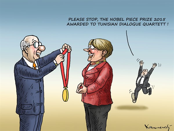 واهتمت صحيفة “التايمز” بتوجه أنظار العالم نحو ألمانيا اعتقادًا بأن المستشارة الألمانية أنجيلا ميركل ستحصد جائزة نوبل للسلام بسبب موقف ألمانيا من اللاجئين، إلا أن المفاجأة جاءت حين فازت لجنة تونس الرباعية بها.