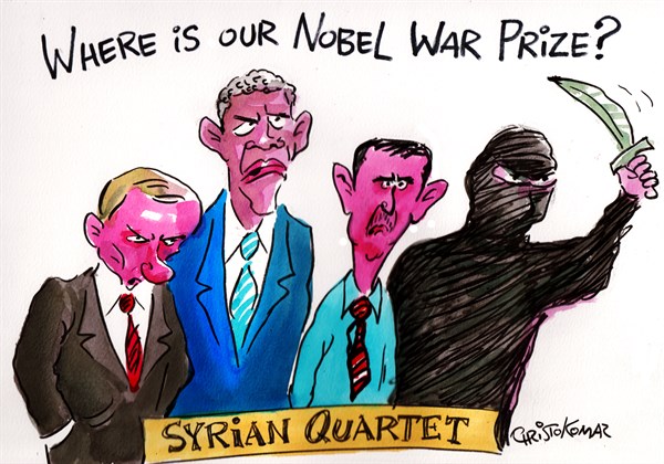 واهتمت صحف أخرى بمسابقة نوبل، والتي تم الإعلان عن الفائزين بها أول أمس، فقامت بنشر تساؤل أوباما وبشار الأسد وبوتين وداعش عن مدى أحقيتهم في الفوز بالجائزة بعد دورهم في سوريا.