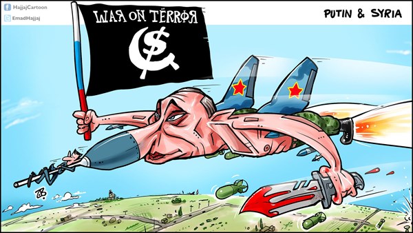 أما موقع كاجل، فنشر “كارتون” للرسام عماد حجاج يسخر فيه من تدخل الرئيس الروسي فلاديمير بوتين في سوريا وادعائه أنه يواجه حربًا ضد الإرهاب.