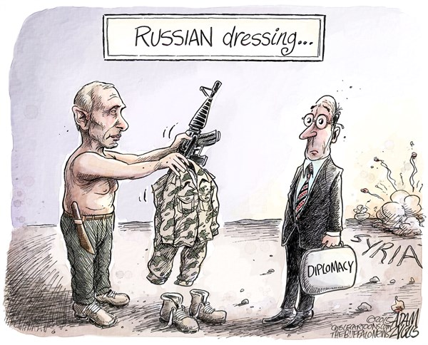 وفي السياق نفسه، جاء ذلك الكاريكاتير ليسخر من الدبلوماسية الروسية التي تتجه لارتداء زي الحرب في سوريا
