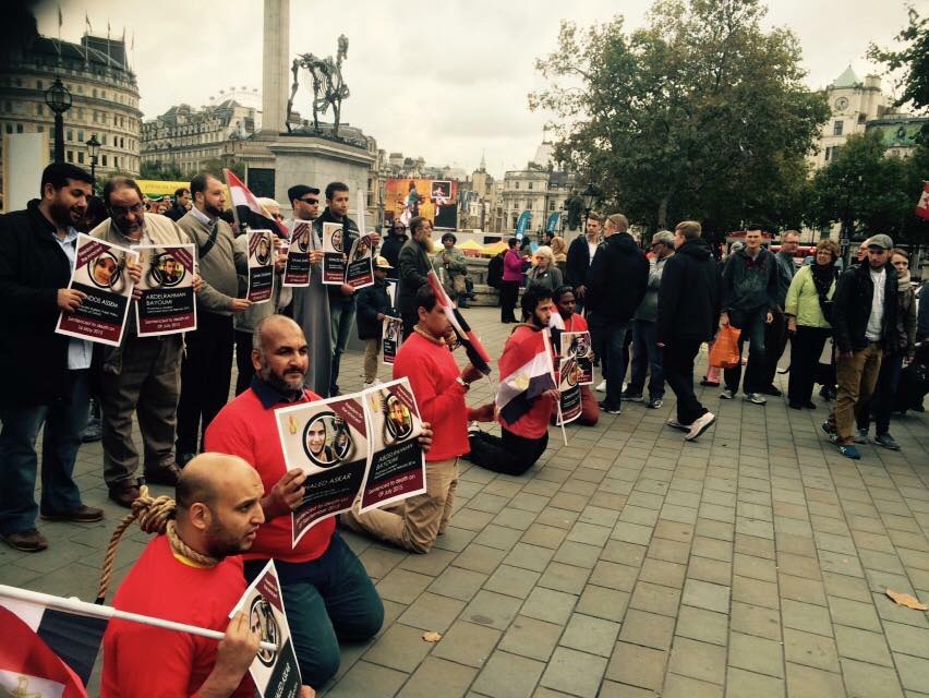 استجابة لدعوات حملة “إعدام وطن” نظم عشرات النشطاء السياسيين وقفة احتجاجية بميدان ترافلجار بالعاصمة البريطانية لندن مساء اليوم، للتنديد بأحكام الإعدام السياسية التي تصدر بحق معارضي الحكم العسكري في مصر.
