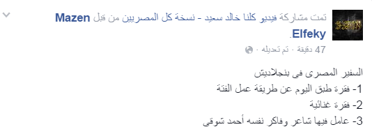 وعلق مازن الفقي: “السفير المصري في بنجلاديش 1- فقرة طبق اليوم عن طريقة عمل الفتة 2- فقرة غنائية 3- عامل فيها شاعر وفاكر نفسه أحمد شوقي”.