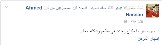وقال أحمد حسن: “دا مش سفير دا طباخ وقاعد في مطعم وشكله جعان”.