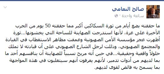 وقال -عبر منشور له على “فيس بوك”-: إن مكاسب ثورة السكاكين أكبر لأنها “استدرجت الصهاينة للساحة التي يخشونها، وأظهرت عجز مؤسسة الأمن الصهيونية”.