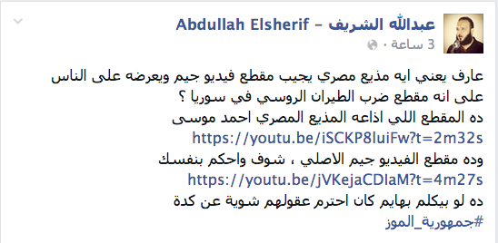 وتساءل الناشط والشاعر “عبدالله الشريف” -خلال منشور له على صفحته على “فيس بوك”-: “عارف يعني إيه مذيع مصري يجيب مقطع فيديو جيم ويعرضه على الناس على إنه مقطع ضرب الطيران الروسي في سوريا؟، ساخرًا: لو بيكلم بهايم كان احترم عقولهم شوية”.