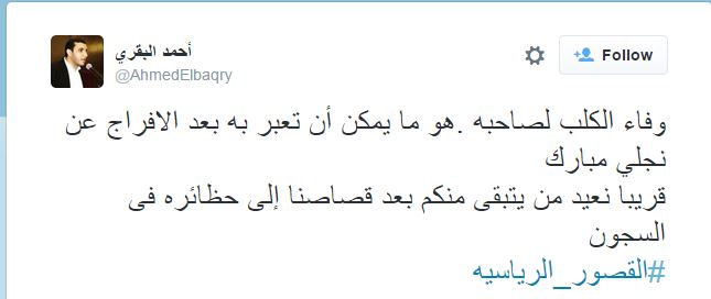 وقال أحمد البقري: “وفاء الكلب لصاحبه.. هو ما يمكن أن تعبر به بعد الإفراج عن نجلي مبارك.. قريبًا نعيد من يتبقى منكم بعد قصاصنا إلى حظائره في السجون”.