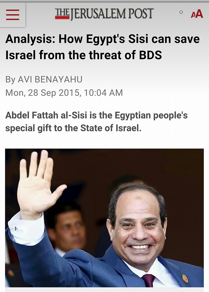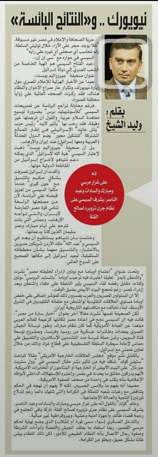 قال الكاتب الصحفي عماد الدين حسين، رئيس تحرير جريدة “الشروق” المصرية، في مقاله المنشور أمس بـ”الشروق”: “كل من زعم أن صحيفة “جيروزاليم بوست” قالت إن السيسي هبة المصريين لإسرائيل، هم من الإخوان المسلمين وأنصارهم، وأنهم يكذبون ويدلسون.