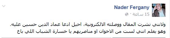وعلق نادر فرجاني، أستاذ العلوم السياسية بجامعة القاهرة -عبر “فيس بوك”- بقوله: “ولأنني نشرت المقال ووصلته الإلكترونية، أحيل ادعاء عماد الدين حسين عليه، وهو يعلم أنني لست من الإخوان أو مناصريهم”.