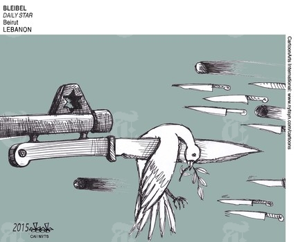 كما نشرت الصحيفة كاريكاتيرا آخر يشير إلى أن إسرائيل هي من ذبحت حمامة السلام وليس عمليات الطعن في الأحداث الأخيرة التي تشهدها الضفة والقدس:
