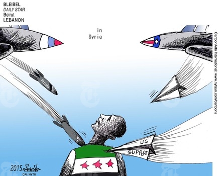 نشرت جريدة “نيويورك تايمز” الأميركية، كاريكارتيرا تسخر فيه من الدعم الأميركي للشعب السوري الذي يقصف بالأسلحة الروسية:
