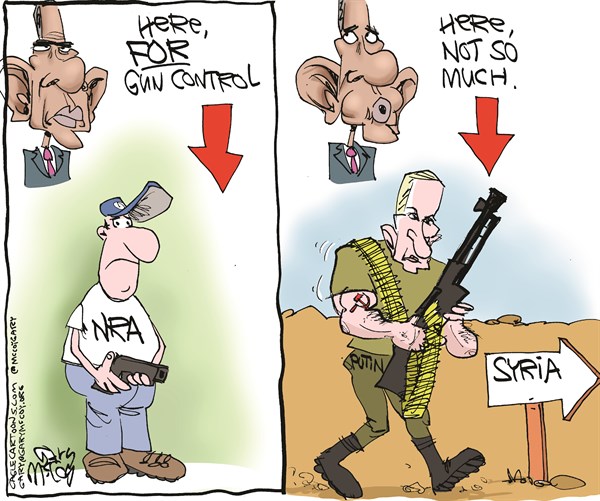 وسخر موقع “كاجل”، عبر كاريكاتير قام بنشره، من رغبة الحزب الديمقراطي منع الأسلحة داخل الولايات المتحدة، في الوقت الذي يتركون روسيا بأسلحتها تعيث في سوريا فسادا.