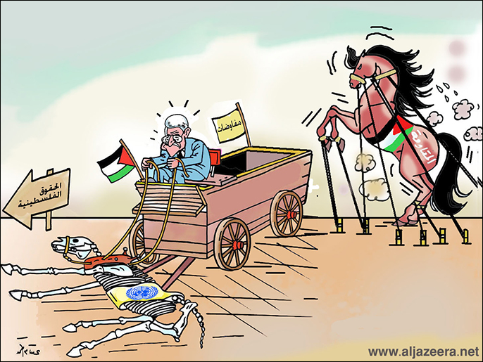 وجاء كاريكاتير “الجزيرة” معبرا عن كون مفاوضات عباس بالقدس ليس لها حصان، في حين أن حصان المقاومة ملجم ومقيد، في تعليق على الأحداث الجارية في فلسطين.