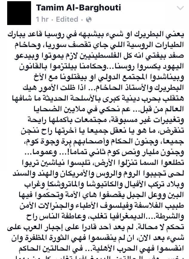 حذر الشاعر الفلسطيني، تميم البرغوثي، من نشوب حرب دينية عالمية لم يشهدها العالم من قبل، في ظل الصراعات التي تشهدها سوريا وفلسطين، إذا ظلت الأمور على حالها. وقال -عبر منشور له على “فيس بوك”-: “يعني البطريرك أو شيء بيشبهه في روسيا قاعد يبارك الطيارات الروسية اللي جاي تقصف سوريا، وحاخام صفد بيفتي إن كل الفلسطينيين لازم يموتوا وبيدعو اليهود يكسروا روسنا، وحكامنا بيلتزموا بالقانون وبيناشدوا المجتمع الدولي أو بيقتلونا مع الأخ البطريرك والأستاذ الحاخام”.