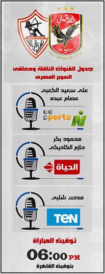 وتذاع المباراة على القنوات التالية: أبو ظبي الرياضية والنيل للرياضة والحياة وten.