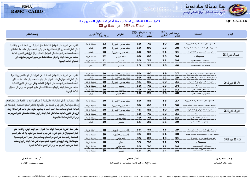 كما تظهر السحب المنخفضة والمتوسطة على السواحل الشمالية وتقل الرؤية في الشبورة المائية صباحا على شمال البلاد واضطراب في حركة الملاحة البحرية، وتسجل القاهرة والوجه البحري غدًا الأحد، الكبرى 31 والصغرى 26.