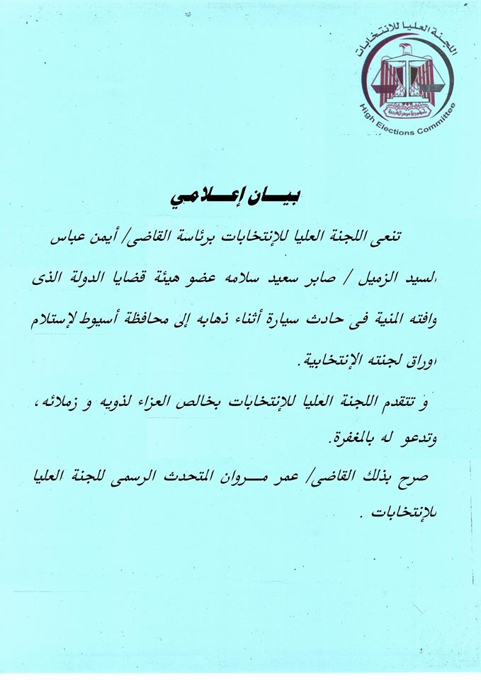 أعلنت اللجنة العليا للانتخابات البرلمانية مساء السبت، وفاة المستشار صابر سعيد سلامة، عضو هيئة قضايا الدولة، في حادث سيارة أثناء ذهابه لمحافظة أسيوط لاستلام أوراق لجنته الانتخابية.