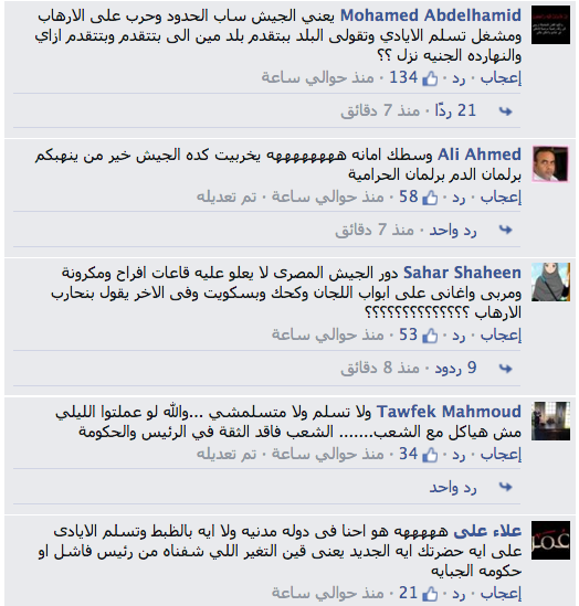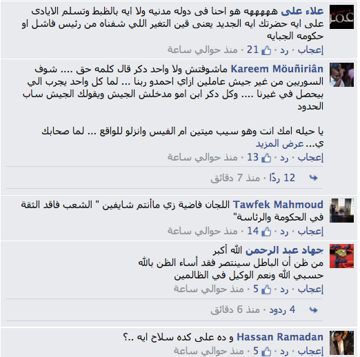 وتساءل أحد رواد فيس بوك “هو احنا فى دوله مدنيه ولا ايه بالظبط وتسلم الايادى على ايه حضرتك ايه الجديد يعنى فين التغير اللي شفناه من رئيس فاشل او حكومه الجبايه ، بينما قال آخر: اللجان فاضية زي ماأنتم شايفين ” الشعب فاقد الثقة في الحكومة والرئاسة”.