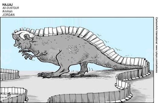 “نيويورك تايمز” تصور الحكومة الإسرائيلية بصورة ديناصور يستخدم الجدر العازلة لتحميه من انقراض وشيك: