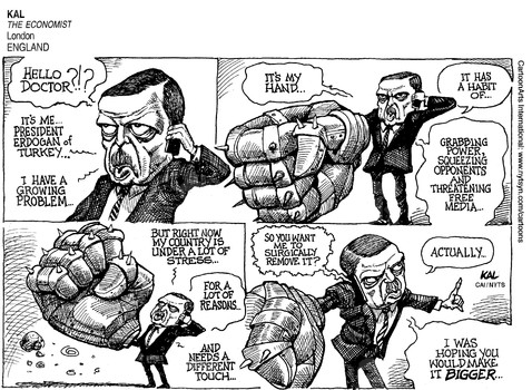 وتناولت “نيورك تايمز” تعامل الرئيس التركي أردوغان، الخاطئ مع مشاكل بلده في رسم يشتكي فيه لطبيبه من قبضته القوية: