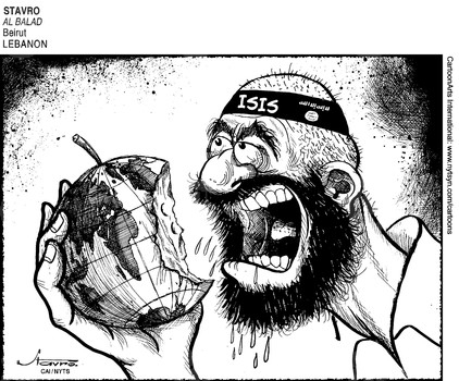 “نيويورك تايمز” نشرت هذا الرسم الذي جاء تعبيرا عن رغبة داعش في التهام العالم.