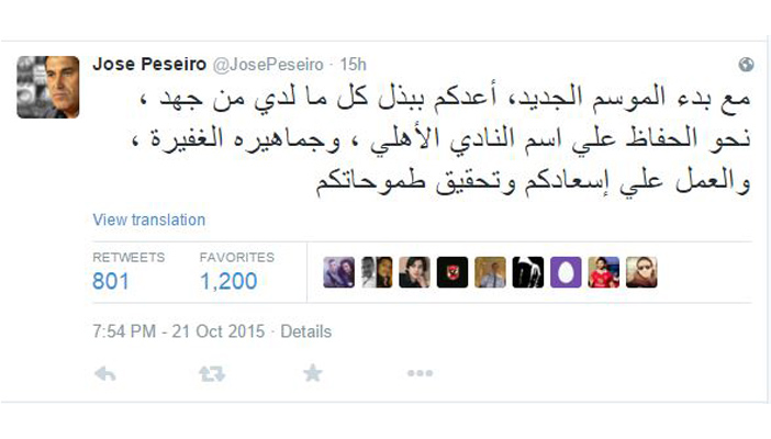 كتب البرتغالي جوزيه بيسيرو، المدير الفني للفريق الأول لكرة القدم بالنادي الأهلي، تغريدة على حسابه الرسمي بموقع التواصل الاجتماعي “تويتر”، من أجل جماهير النادي الأهلي.