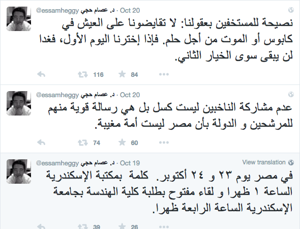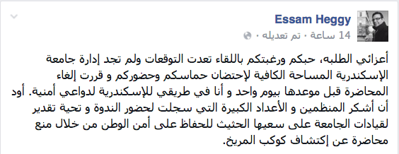 قال حجي في اعتذار ساخر للطلاب: “أعزائي الطلبة، حبكم ورغبتكم باللقاء تعدت التوقعات ولم تجد إدارة جامعة الإسكندرية المساحة الكافية لاحتضان حماسكم وحضوركم وقررت إلغاء المحاضرة قبل موعدها بيوم واحد وأنا في طريقي للإسكندرية لدواع أمنية”.