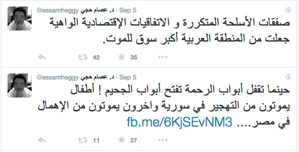 وتابع: “حينما تقفل أبواب الرحمة تفتح أبواب الجحيم ! أطفال يموتون من التهجير في سورية وآخرون يموتون من الإهمال في مصر”.