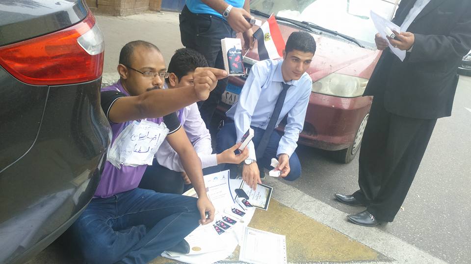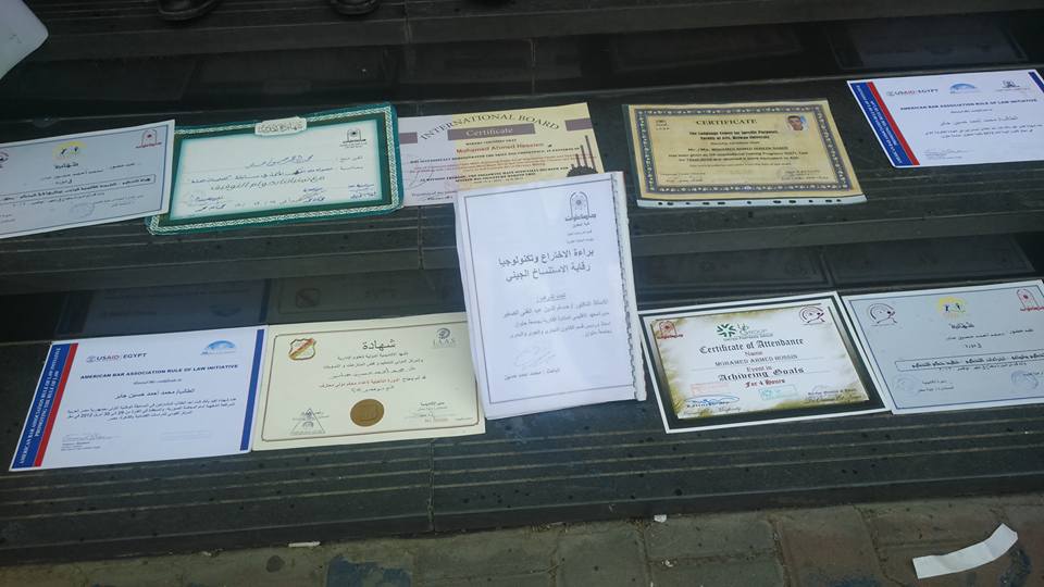 جلس عدد من المحتجين على الرصيف في إشارة المرور وقاموا ببيع المناديل ووضع شهاداتهم على الأرض، في تعبير ساخر عن عدم اهتمام الحكومة بحملة الماجستير والدكتوراه.