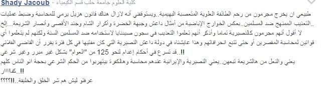 وقال hady Jacoub “كل”طبيعي ان يخرج مجرمون من رحم الطائفة العلوية المتعصبة البهيمية.. ويستوقفني أنه لا يزال هناك قانون هزيل يرمي للمحاسبة وضبط عمليات التعذيب الممنهج ضد المسلمين.. بعكس الخوارج الإباضية من أمثال داعش وجبهة الخضرة وأكرار الشام وجند الأقصى وأنصار الشريعة.. لا أقول إنهم مجرمون كالنصيرية تمامًا، ولكنهم لم يتعلموا أي قوانين لمحاسبة المقصرين أو حتى تتبع انحرافاتهم وهذا عايشناه في دولة داعش النصيرية”.