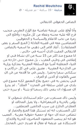 وأضاف “بل ممنوع حتى خارجه من الدول المتعاونة أمنيًا مع السلطة المغربية بمذكرة وزارية من الخارجية المغربية، مضيق علي في كل حركاتي وسكناتي سفرًا وحضرًا، وليس في ما أقدمه من فن أي مسٍ بالقانون أو الدين أو العرف”.