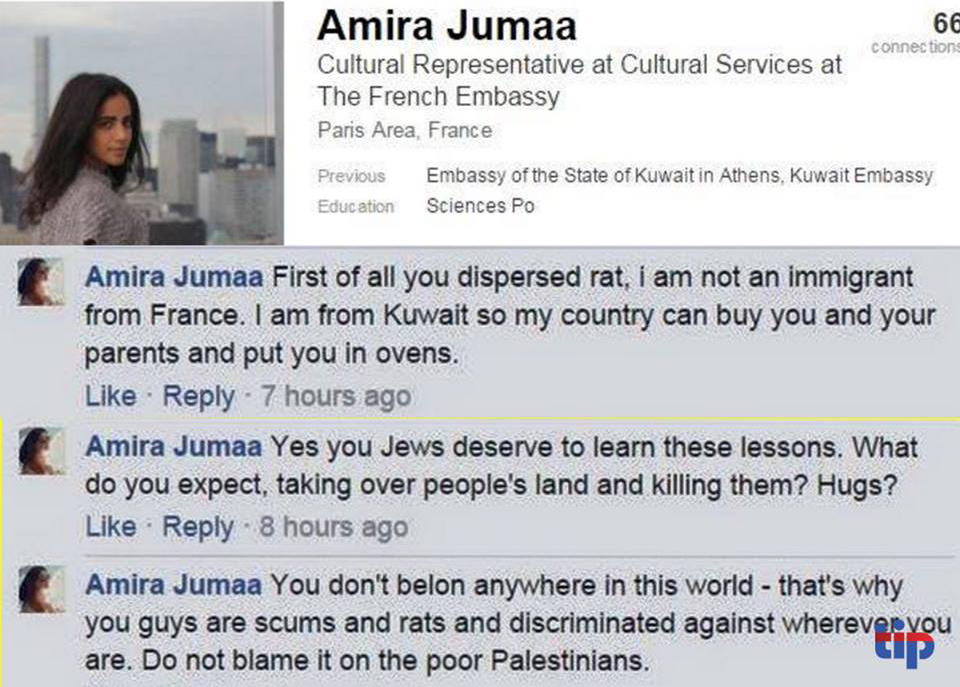 وبعد أن اتهمها الشخص الذي كانت تحاوره على “فيس بوك” بالعنصرية ردت عليه بقولها: “أنا لست مهاجرة قادمة من فرنسا أيها الفأر. أنا من الكويت وبإمكان بلادي أن تشتريك أنت وأهلك ووضعكم في أفران”، ثم أغلقت صفحتها مباشرة بعد هذه الكتابات.