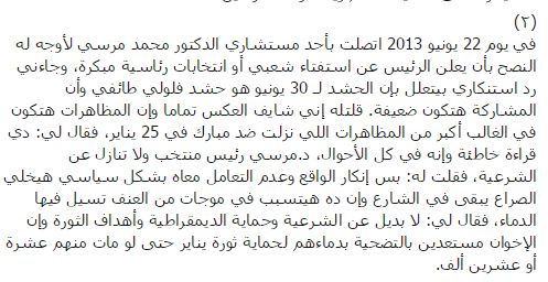 وأضاف “غنيم” أنه رد عليه بأنه يرى العكس تمامًا، وأن المظاهرات ستكون في الغالب أكبر من المظاهرات التي نزلت ضد مبارك في 25 يناير، فقال له إنها قراءة خاطئة وإنه في كل الأحوال دكتور مرسي رئيس منتخب ولا تنازل عن الشرعية، فرد “غنيم” بأن ذلك إنكار للواقع وعدم التعامل معاه بشكل سياسي سيجعل الصراع في الشارع، وسيتسبب في موجات من العنف تسيل فيها الدماء، فقال له: لا بديل عن الشرعية وحماية الديمقراطية وأهداف الثورة والإخوان مستعدون للتضحية بدمائهم لحماية ثورة يناير حتى لو مات منهم عشرة أو عشرين ألف.