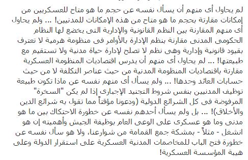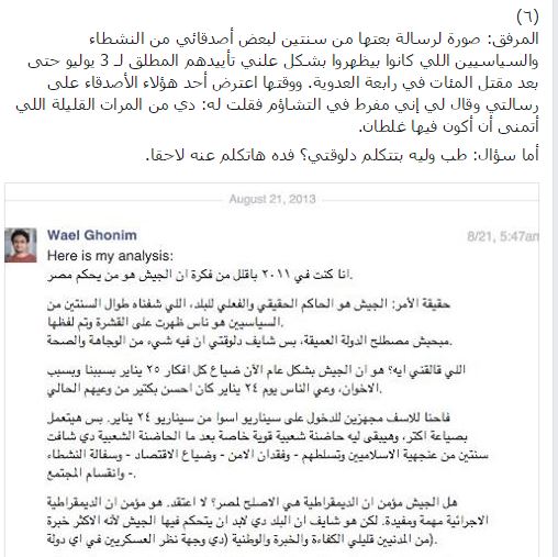 وأرفق “غنيم” منشوره بصورة لرسالة بعثها منذ عامين  لبعض أصدقائه من النشطاء والسياسيين الذين كانوا يظهرون بشكل علني تأييدهم المطلق لـ3 يوليو حتى بعد مقتل المئات في رابعة العدوية، مضيفًا “ووقتها اعترض أحد هؤلاء الأصدقاء على رسالتي وقال لي إني مفرط في التشاؤم فقلت له: دي من المرات القليلة اللي أتمنى أن أكون فيها غلطان”.