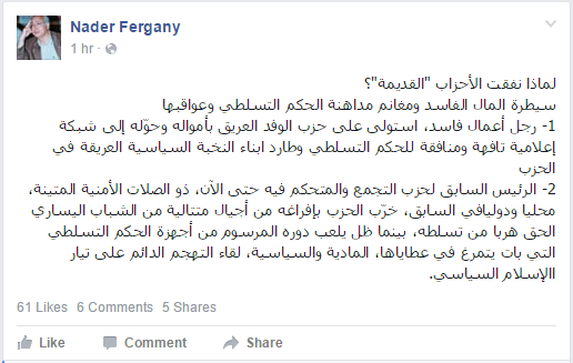 وأضاف فرجاني في منشور له على صفحته بموقع التواصل الاجتماعي”فيسبوك” :”رجل أعمال فاسد، استولى على حزب الوفد العريق بأمواله وحوّله إلى شبكة إعلامية تافهة ومنافقة للحكم التسلطي، وطارد أبناء النخبة السياسية العريقة في الحزب”.