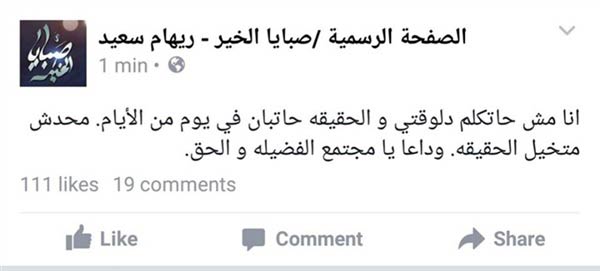 وأضافت ريهام سعيد بمنشور خلال صفحه برنامجها الرسمية، على موقع التواصل الاجتماعي “فيس بوك”: “لن أتحدث الآن والحقيقة ستظهر في يوم من الأيام.. لا أحد يتخيل الحقيقة.. وداعًا يا مجتمع الفضيلة والحق”.