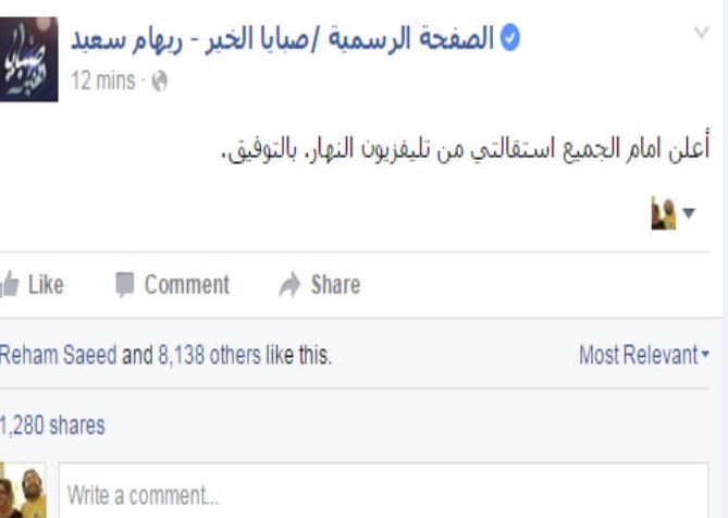 ولم يكن ذلك المنشور الوحيد الذي تتراجع فيه ريهام وتحذفه، إذ قامت بنشر ما يفيد باستقالتها من قناة النهار، إلا نه تم حذفه مرة أخرى.